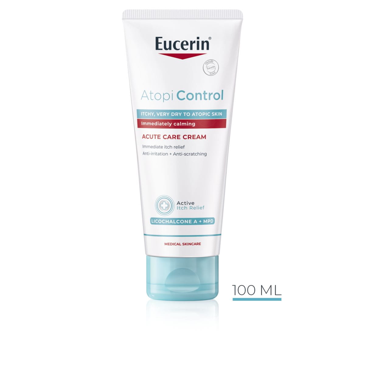 Eucerin AtopiControl intensyvaus poveikio kremo formulė yra specialiai skirta intensyviai puoselėti ir nuraminti odą atopinio dermatito paūmėjimų metu. Sudėtyje dera unikalus veikliujų medžiagų kompleksas: raminantis likochalkonas A, antibakterinėmis savybėmis pasižymintis dekandiolis, niežėjimą lengvinantis ir vėsinantis mentoksipropandiolis. Šis kompleksas kartu su didele koncentracija keramidų, sustiprina odos barjerą, sumažina sausumą ir palengvina niežėjimą, taip sumažindamas norą kasytis.