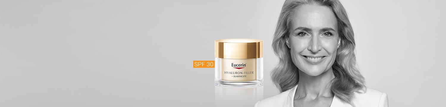 Eucerin Hyaluron-Filler + Elasticity linija yra specialiai sukurta siekiant sumažinti gilias raukšles ir senatvines dėmes, padidinti odos elastingumą, suteikti švytėjimo. Naujoviškas Eucerin didelės ir mažos molekulinės masės hialurono rūgščių derinys pastebimai užpildo net gilias raukšles, o galingas arktiino ir kreatino (kolageno-elastino komplekso) derinys atnaujina kolageno gamybą ir padidina odos elastingumą. Be to, klinikiniais tyrimais patvirtinta, kad veiklioji medžiaga Thiamidol sumažina senatvines dėmes (pirmieji rezultatai pastebimi po 2 savaičių).