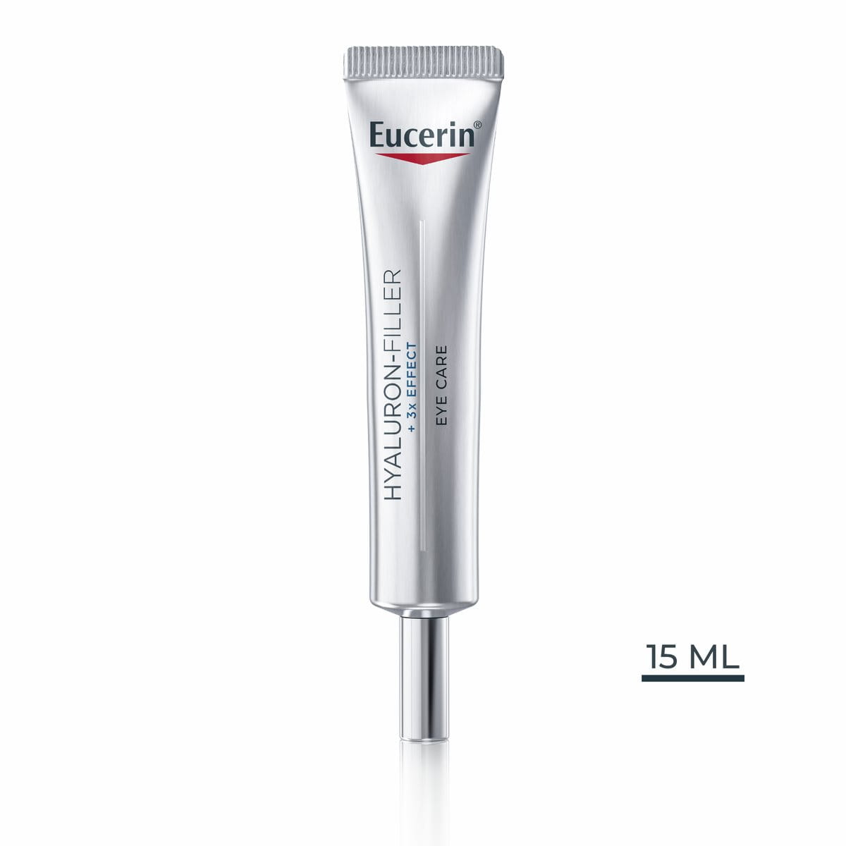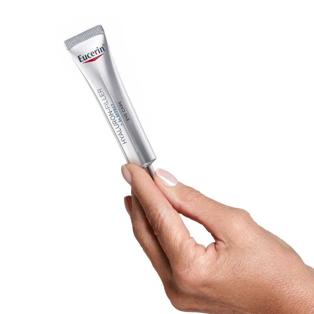 Eucerin Hyaluron-Filler +3x Effect akių srities kremas SPF 15 pastebimai sumažina smulkių raukšlelių ir raukšlių matomumą. Jo 3x EFFECT formulė veikia trimis būdais: didelės ir mažos molekulinės masės hialurono rūgštis mažina raukšlių matomumą, glicino saponinas palaiko odos natūralios hialurono rūgšties gamybą ir padeda atitolinti priešlaikinių odos senėjimo požymių atsiradimą. Formulė, kurios sudėtyje nėra kvapiųjų medžiagų, greitai įsigeria ir yra išbandyta oftalmologiškai, todėl tinka kasdieniam naudojimui, taip pat prieš naudojant makiažo priemones.
