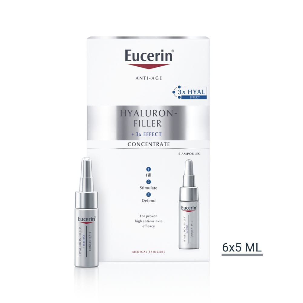 The Eucerin Hyaluron-Filler range plumps the skin, reducing the appearance of the first wrinkles. With a dual efficacy and for all skin types, the Hyaluron Filler Night Peeling & Serum combats the signs of ageing and deeply moisturises; worn overnight, it is proven to refine the skin’s texture and noticeably improve its appearance, leaving pores reduced and the face significantly firmer. The Concentrate is an intensive anti-wrinkle face serum; its formula with Hyaluronic acid combines perfectly with the same line’s day and night creams.