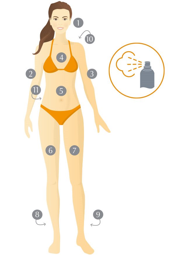Įvairioms kūno vietoms naudojamas aerozolinis purškiklis leidžia greitai ir lengvai padengti produktą ant sunkiai pasiekiamų odos vietų. Skaidrus ir nelipnus purškiklis greitai susigeria, atgaivina odą ir yra atsparus vandeniui.